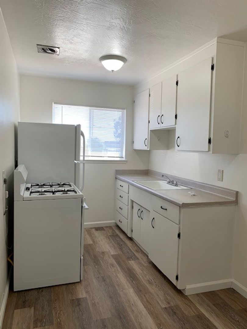 Great one bedroom one bath duplex. newer gas stove, fridge, lvp wood flooring in living room, kitchen and bathroom and carpet in bedroom, coin op washer and dryer, off street parking. Owner pays sewage.